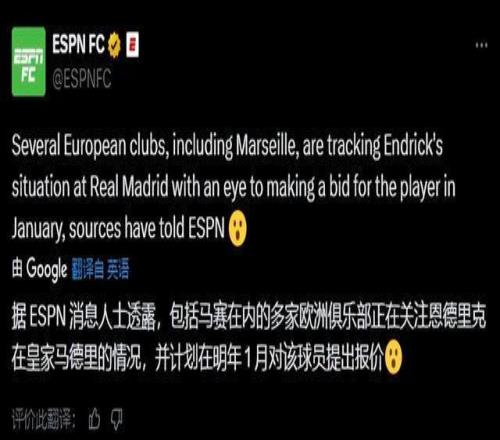 据ESPN报道,马赛已就恩德里克一月租借的可能性向皇马进行了初步询问,且这并非皇马收到的唯一一份问价。皇马预计在冬窗前还会有更多类似的接触。事实上,今年夏天皇马就曾建议恩德里克外租寻找机会,但球员本人坚持留下,争取在阿隆索麾下获得机会。