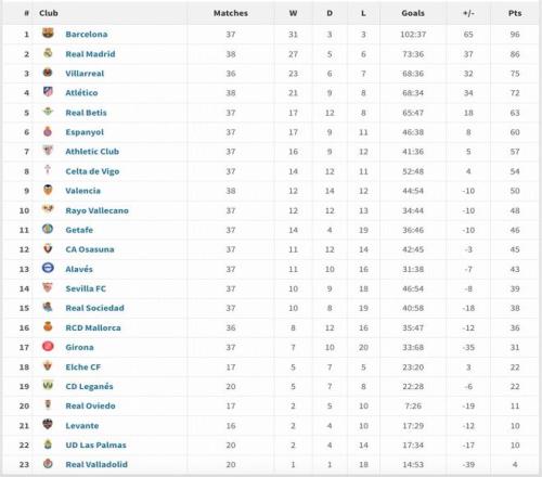 2025年度西甲积分榜:巴萨37战31胜高出皇马10分,马竞第四