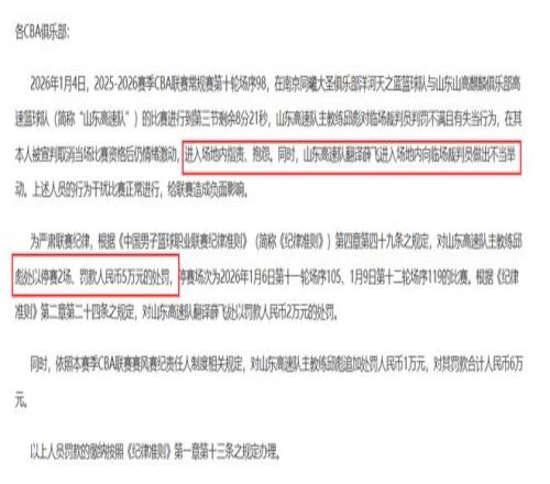 根据CBA官网给出的罚单公告,CBA公司对邱彪对临场裁判员判罚不满且有失当行为,在其本人被宣判取消当场比赛资格后仍情绪激动,进入场地内指责、抱怨。同时,山东高速队翻译薛飞进入场地内向临场裁判员做出不当举动。以“上述人员的行为干扰比赛正常进行,给联赛造成负面影响”为由。