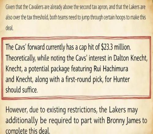 另一边,对骑士而言,他们是近两个赛季联盟支出最多的球队之一,却并没有取得预期的成绩,目前仅以29胜21负排在东部第五,他们迫切想要摆脱亨特下赛季近2500万美元的合同。