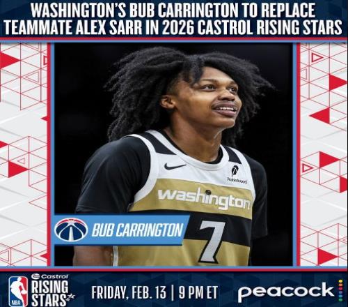 在弗拉格与萨尔因伤缺席全明星新秀挑战赛情况下,他们的顶替者出炉,分别是爵士新科5号秀贝利,他本赛季场均得到11.6分3.8 篮板,以及奇才2024年14号秀卡林顿,他本赛季场均得到10.2分3.5篮板4.6助攻。