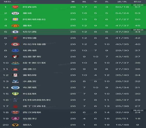 英超最新积分榜