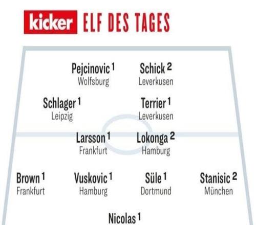 踢球者德甲第15轮最佳阵:斯塔尼希奇、聚勒、希克等球员在列 -
